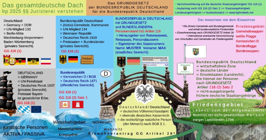 Über die Inhaberschaft der NS-Staatsangehörigkeit 1934 ist der Status der juristischen Person im GG Art. 116 (1) (Schuldner) hergestellt, der die Grundlage zur Ausbeutung in der Staatssimulation der Bundesrepublik Deutschland ermöglicht. Die tatsächliche Staatsangehörigkeit liegt in der Abstammung der Vorfahren vor der Einführung des BGB 1.1.1900 über GG Art.116 (2) Satz 2 (Gläubiger).